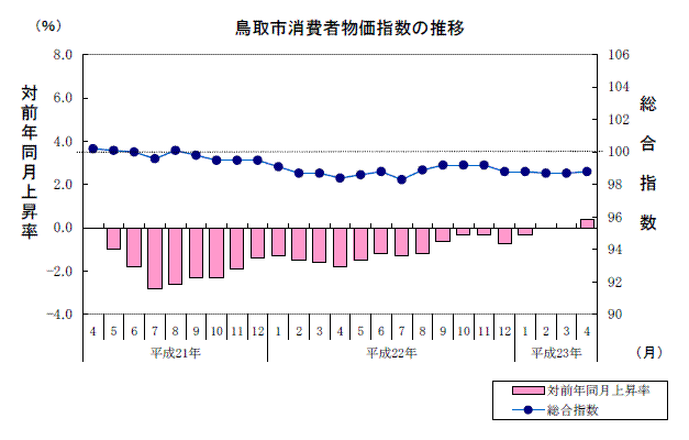 平成23年4月の鳥取市の消費者物価指数は、総合で98.8(平成17年=100)となり、