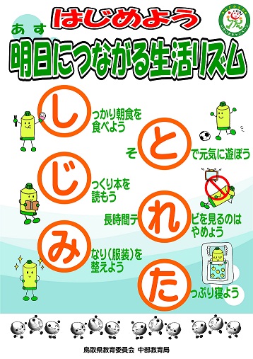 また、中部教育局では、子どもたちの基本的生活習慣の定着に向けた合い言葉「しじみとれた」を提唱します。