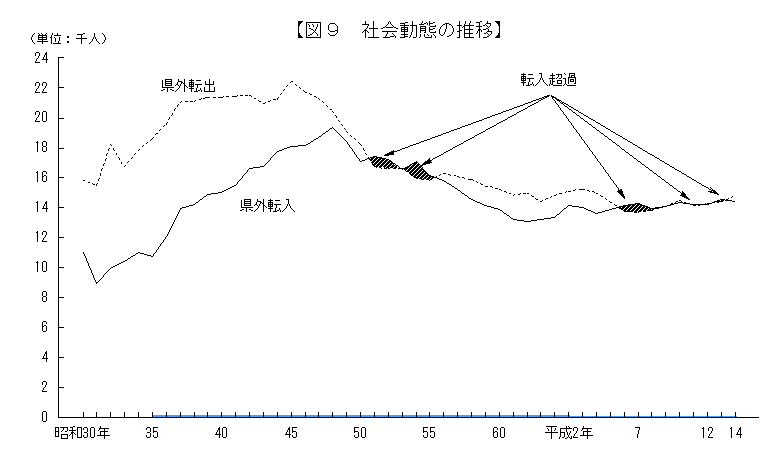 本県の社会動態の推移をみると、日本経済の高度成長期にかけて県外転出者数が県外転入者数を大幅に上回り、転出超過が続いていたが、第1次石油危機による経済停滞などを背景として、昭和40年代後半から県外転出者数と県外転入者数の差が縮まり、昭和51年には両者が逆転して初めて転入超過となった。その後昭和53年には再び転出超過、翌54、55年には転入超過、昭和56年以降は再び転出超過が続いていたが、平成6~8年は転入超過となった。平成9年は県外転入者数と県外転出者数が同数であったため、社会増加は±0であった。その後は県外転入と県外転出がほぼ均衡し、平成11年と平成13年は転入超過となった。平成14年は前年に比べて県外転入者が減少する一方、県外転出者は増加したため、全体で408人の転出超過となった。