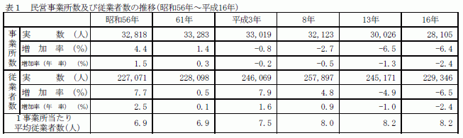 一方、従業者数の増加率(年率)をみると、昭和61年~平成3年が1.6%増、平成3年~平成8年が0.9%増、平成8年~平成13年が1.0%減、今回調査(平成13年~平成16年)では2.4%減と平成8年調査をピークとして2回続けて減少した。