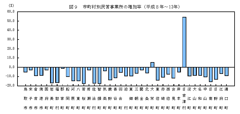 市町村別に民営事業所の増減を前回調査と比べると、日吉津村が71事業所の増 (54.2%増)、大栄町が18事業所の増(5.1%増)となった以外は全ての市町村で減少している。事業所数の減少数の多い市町村は、鳥取市が452事業所の減、倉吉市が320事業所の減、米子市が223事業所の減などとなっており、減少率の大きい市町村は、智頭町が17.7%減、若桜町が17.6%減、佐治村が17.4%減などとなっている。 また、従業者数を前回調査と比べると、日吉津村が1,043人の増(95.5%増)、米子市が371人の増(0.6%増)、西伯町が140人の増(7.9%増)、岸本町が118人(6.8%増)となった以外は全ての市町村で減少している。従業者数の減少数の多い市町村は、鳥取市が4,126人の減、境港市が2,047人の減、倉吉市が2,045人の減などとなっており、減少率の大きい市町村は用瀬町が27.0%減、鹿野町が21.9%減、日野町が19.9%減などとなっている。