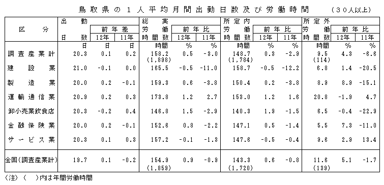全国の総実労働時間は、調査産業計で年間1,859時間となり、鳥取県(1,898時間)より39時間短くなっている。