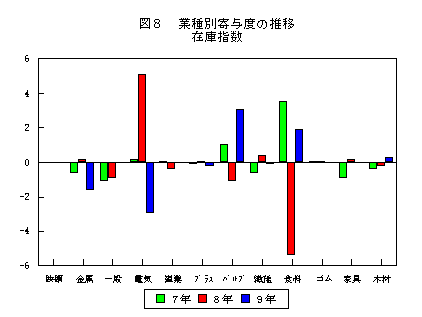 これを業種別の寄与度でみると、電気機械工業が▲2.6、食料品・たばこ工業が▲1.4、一般機械工業が▲0.9、繊維工業が▲0.4の順になっている。