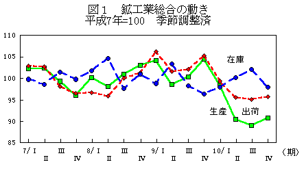 平成10年の鳥取県の鉱工業動向は、生産指数が対前年比▲ 9.5%と低下し、出荷指数も▲7.2%と低下した。生産は3年ぶり、出荷は2年ぶりの低下となった。一方、在庫指数は0.4%と上昇し、2年ぶりのプラスとなった。鉱工業指数を生産、出荷、在庫別で見ると、生産は、前年同期比では1.期が▲4.3%、2.期が▲10.0%、3.期が▲11.8%、4.期には▲11.9%とマイナス幅が拡大し、依然として厳しい状態が続いているといえる。しかし、前期比でみた場合には、1.期が▲5.6%、2.期が▲8.2%と低水準が続いたが、3.期に▲1.5%、4.期には1.9%のプラスとなり、回復傾向がみられる。出荷は、前年同期比では1.期が▲5.9%、2.期が▲7.1%、3.期が▲6.8%、4.期には▲8.9%と低水準が続いている。しかし、前期比でみた場合には、1.期が▲5.5%、2.期が▲3.8%、3.期が▲0.5%とマイナス幅が縮小し、4.期が0.7%とプラスに転じた。在庫は、前年同月比では、1.期が▲1.0%、2.期が▲2.1%と低下したものの、3.期が3.5%、4.期が1.2%と上昇している。一方、前期比では1.期から3.期までは、2%前後の上昇を続けたが、4.期には、▲4.0%のマイナスとなった。