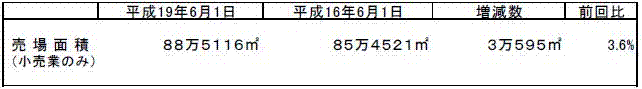 売場面積は885,116平方メートルで、前回に比べ30,595平方メートルの増加(3.6%増)と、昭和63年調査以降、増加している。