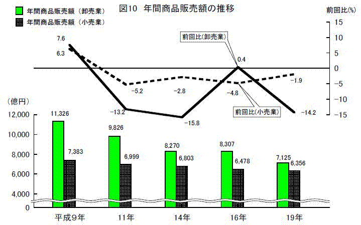 年間商品販売額は1兆3481億5592万円で、前回に比べ1302億5712万円の減少(8.8%減)となった。平成9年調査の1兆8709億1352万円をピークに減少が続いている。