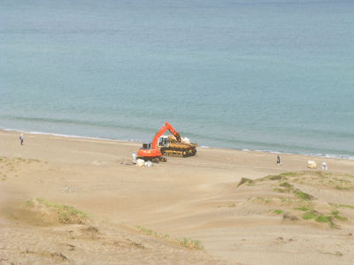 そして今日、人の力ではどうにもならない砂丘の大型ゴミを回収するため、今度は巨大な機械の力を借りて海岸部のクリーンアップ事業が行われました。