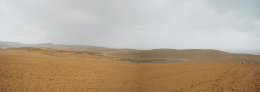 どんよりした空模様です。上空は厚い雲で覆われています。午前9時00分現在の風向・風速は、南の風2.9メートルで、気温は、砂丘事務所横の温度計で摂氏22.4度を示しています。砂は昨日の雨で湿っています。汚れてもいい靴を用意されると良いでしょう。急な雨も予想されるので、雨具も用意され散策をお楽しみください。