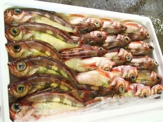 本日の賀露は、沖合底びき網漁船1隻が帰港しました。 賀露はアカガレイ主体で、比較的浅い水深のバラエティに富んだ魚も水揚げされていました。良い情報としては、先週まで漁獲が低調だったハタハタが、また獲れ出し、網代では2000箱以上水揚げされたようです。 【漁獲水深が深い方の魚たち】 この時期は、比較的多くクロザコエビ(もさえび)が水揚げされる時期です。ちょっと高級な食材ですが、おすすめですので是非御賞味ください。