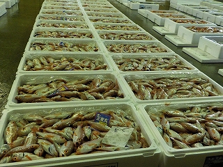 この日、網代港地方卸売市場には地元船4隻が入港していました。主な漁獲物は、ハタハタ(約1500箱)、アカガレイ(500箱弱)、クロザコエビでした。