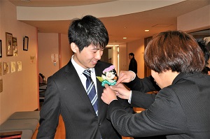 卒業式当日は1年生が卒業生一人一人に、お祝いの言葉と共にコサージュを贈りました。
