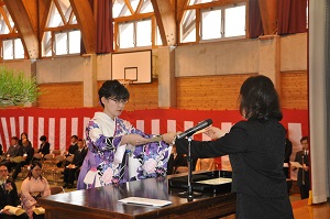 在校生から、記念品と花束を贈られて、熱い抱擁で別れを惜しみました。