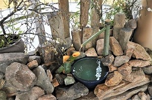 卒業式の日に合わせて開花調節をした桜や竹、石を用いて、日本庭園風の立派な装飾が完成!!