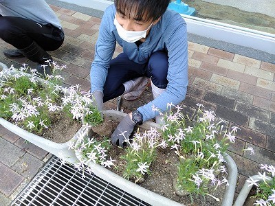 春から夏へと季節が移り替わる今日この頃、花きコースは玄関前花壇の植え替えを行いました。