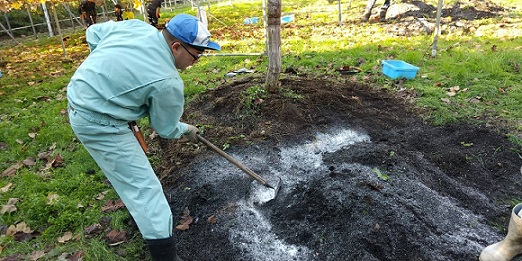 果樹コースでは、現在、土壌改良という作業を進めています。土壌改良とは、10月中旬~11月にかけて、樹の周りに穴を掘り、土壌の性質を良くする資材(以下、土壌改良資材)を投入する作業です。土壌の排水性・保水性・保肥力の改善や、根を伸ばしやすくするといった効果があります。