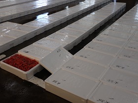 そして、活きたクロザコエビ(もさえび)も多く水揚げされていました。網代では、もさえびの活魚は、出荷の際、海水を使わず、下氷して、湿らせたスポンジを敷き、その上に活きた個体を並べています。海水を使うと、もし1個体でも死んでしまった際、海水が汚れ、他の個体も死んでしまう恐れがあるため、下氷の方がリスクを減らすころができるとのこと。