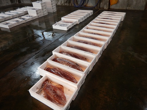 本日の賀露の市場調査です。ソデイカ(アカイカ)の水揚げが続いています。