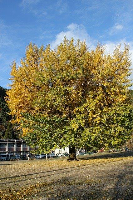 日南町の旧日野上小学校校庭に立つ樹齢約100年の大銀杏が、今年も見頃を迎えています。