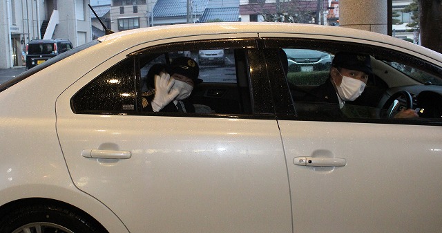 アイドルグループ嵐が歌う曲「カイト」が流れる中、中口選手を日野町職員が温かくお見送り。