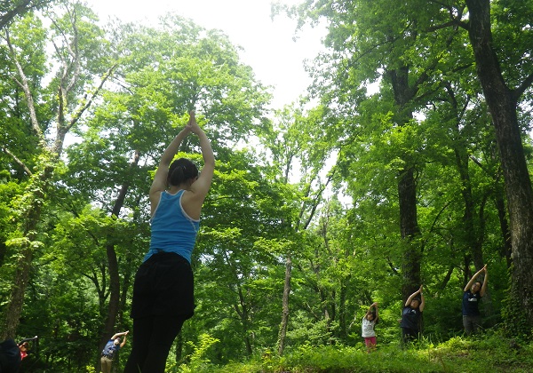 前回のヨガ教室はダム湖で行いましたが、今回は木漏れ日あふれるキャンプ場で行いました。
