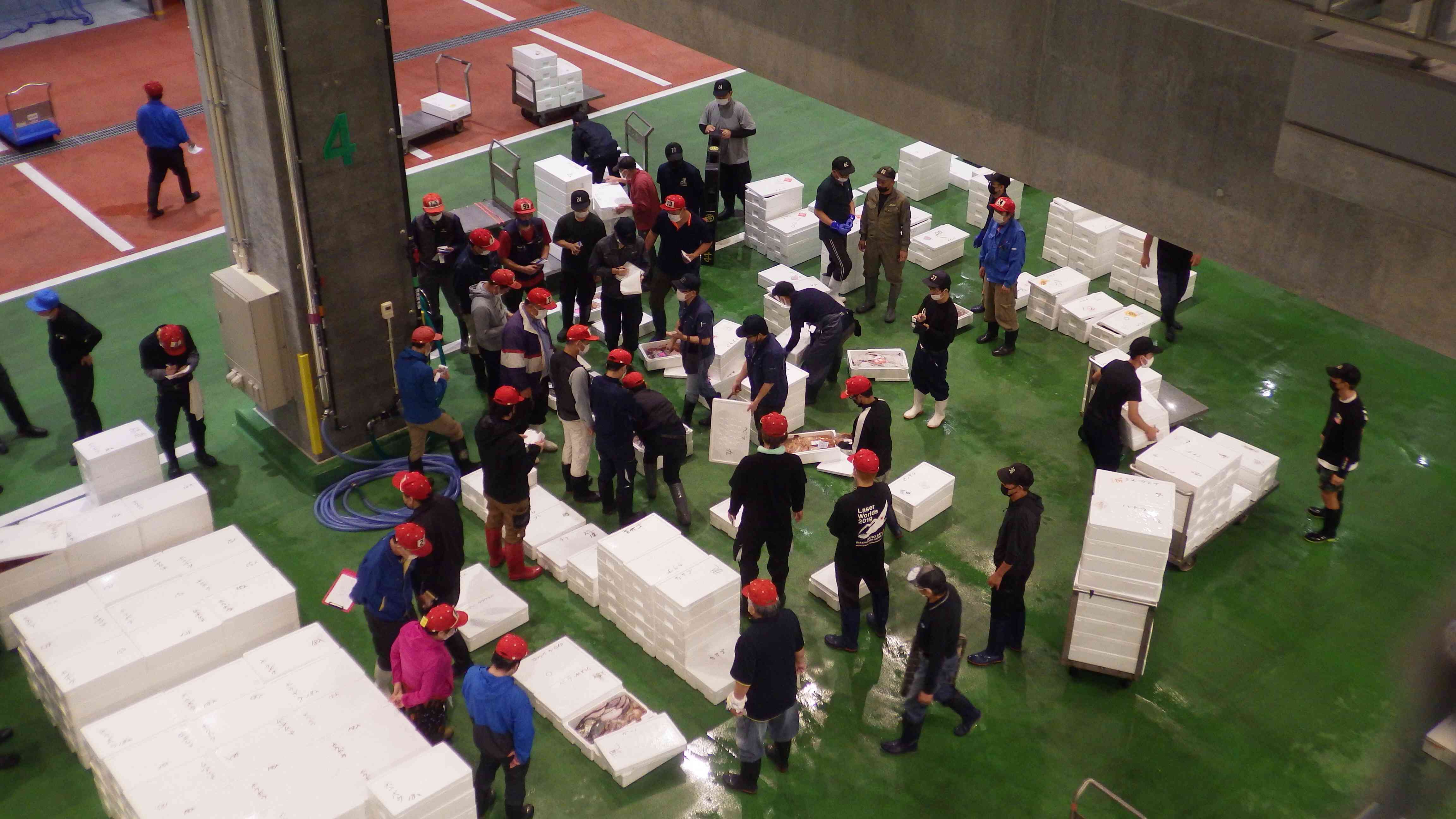 セリは午前5時半から始まり、市場2階の見学通路からその様子を見させて頂きました。上から見ることで、今、どの魚がセリにかけられているか一目瞭然で、次々と値段が付けられていくセリのスピード感がより一層体感できす。