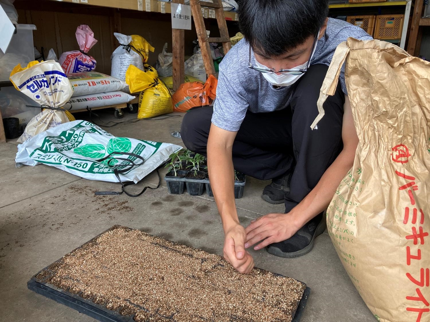 1年生がブロッコリーの播種をしている様子です。今年は栽培面積が少ないので200穴トレイで1枚撒きました。