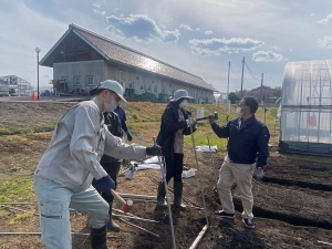 花きコースでは露地圃場の準備で、社会人研修の皆さんと支柱の打ち込みとネット張りをしていました。