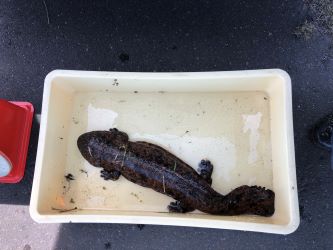 上野さんは、初めは「なんだこれ?きもちわるっ!!」と思ったようですが、もしかしてこれオオサンショウウオではないか、と思い至り、一緒に作業をしていた先輩でサンショウウオに詳しい桐原さんに見てもらったところ、やはり本当にオオサンショウウオのようで、桐原さんはすぐに倉吉市に連絡し、市の担当者に捕獲、調査してもらいました。