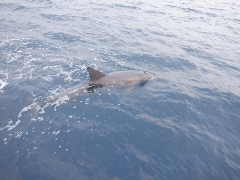 調査中日、その日の調査を終え、隠岐の島周辺に錨を入れて船を停めていたところ、一匹のイルカが近づいてきました。