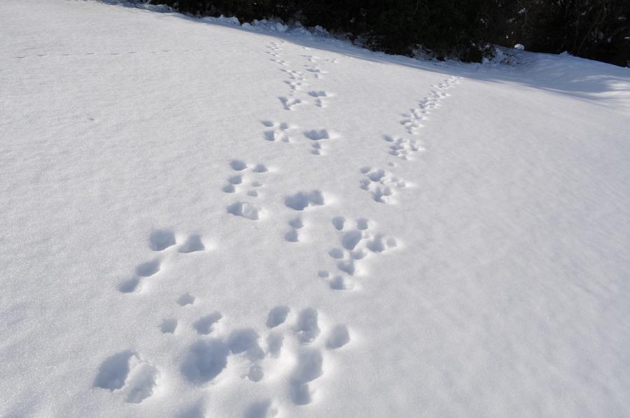 そのうちの一つを紹介しましょう(写真2)。誰の足跡か、お分かりですか。少なくとも同じ動物3頭(親子?)が、この場所を「飛び跳ねた」ようですね。昨年の干支だった彼ら、『古事記』にも「稲羽(因幡)の素(しろ)兎」として登場する親しみのある動物です。今年も園内で、何度かお目にかかれそうですね。