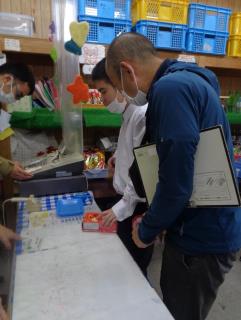 その後は、お仕事の様子を見学し、先輩の接客を受けながら買い物をしました。「いらっしゃいませ。」「ありがとうございました。」と挨拶したり、お客さんからの質問に丁寧に答えたり、落ち着いてレジ打ちをしたり…と、働く先輩の姿を見て、児童からは「すごかった。」との声が聞かれていました!