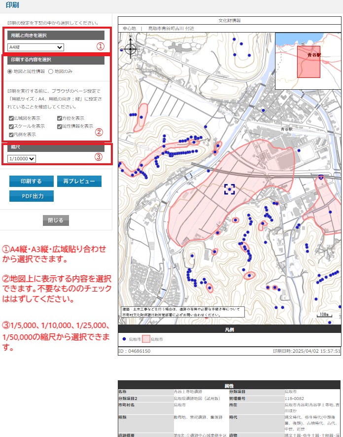 ・鳥取県内の遺跡の位置や範囲を地図上に表示しています(縮尺:1/5000~1/50000)。