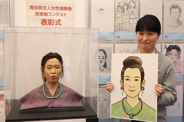4月9日(水)にガイダンス施設YAYOINEで、女性復顔像想像画コンテストの表彰式を行いました。優秀賞の渡部紘巳さんには、賞状のほか受賞作品をプリントしたオリジナルTシャツ、「あおやかみじろう」ぬいぐるみなどの記念グッズを贈呈しました。