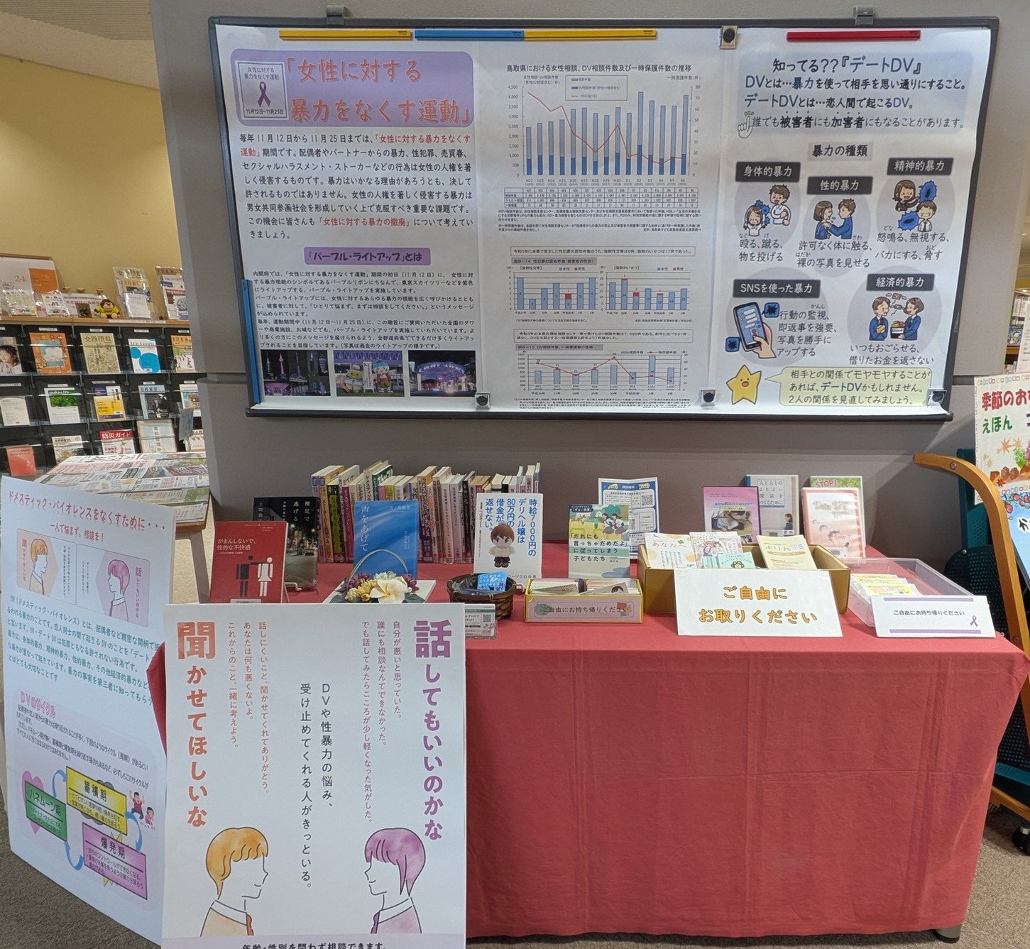 現在よりん彩には、DVやハラスメントに関する資料が250点以上あり、実施期間中に合わせ女性の人権に関する資料を展示しています。