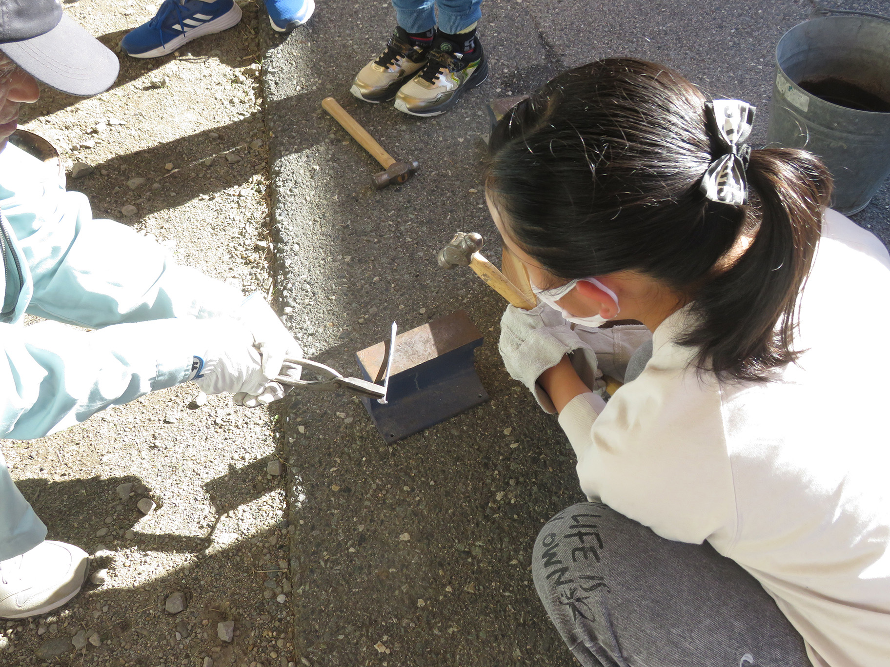鉄器・鉄器づくりの学習の後は、いよいよ鍛冶作業体験です。炭火に鞴(※ふいご)で風を送り、真っ赤になった五寸釘を金づちで叩いてナイフの形にしていきます。