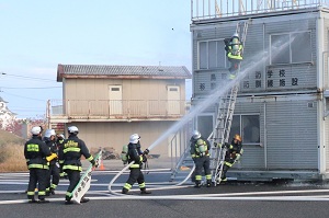 令和7年10月4日(土)、消防団員専科教育警防科第54期を実施した。県内から集まった10名の消防団員が午前中に火災防御、安全管理等の講義を受講し午後から大雨の中、消火栓の取り扱い訓練及び放水技術の向上に熱心に取り組んだ。