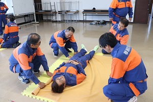 令和7年11月21日に自衛消防職員教育科を開催した。同科は、福祉施設に従事する職員を対象に行われ、今年で67回目となる。近年では各施設とも定期的に火災や地震の避難訓練を実施されているが、消防学校では逃げ遅れや瓦礫の下敷きなどの被害が実際に発生した場合を想定し、より実践的に救助法や搬送法を取り入れた内容で行っている。