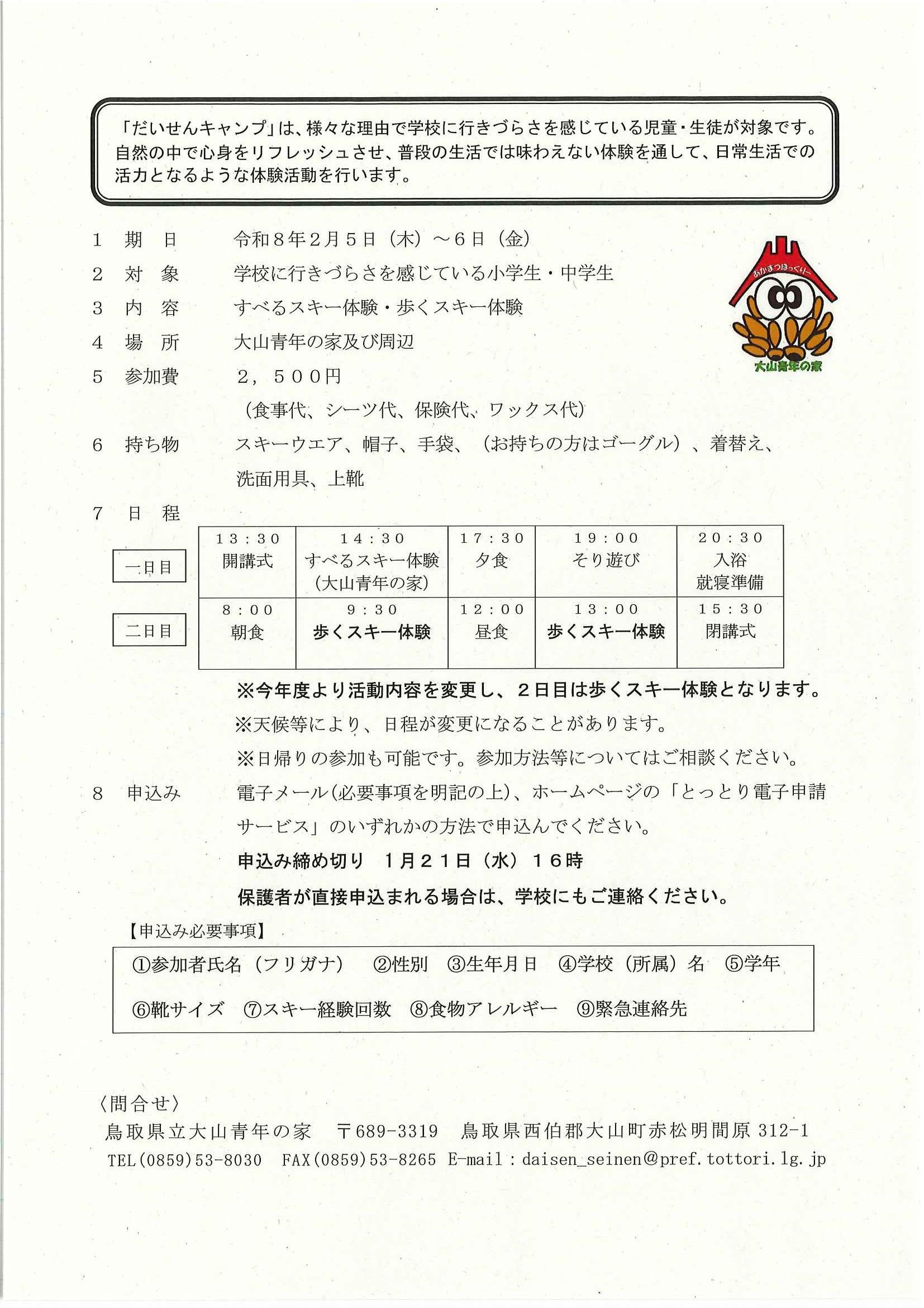 このたび、大山青年の家のイベント等の情報を、