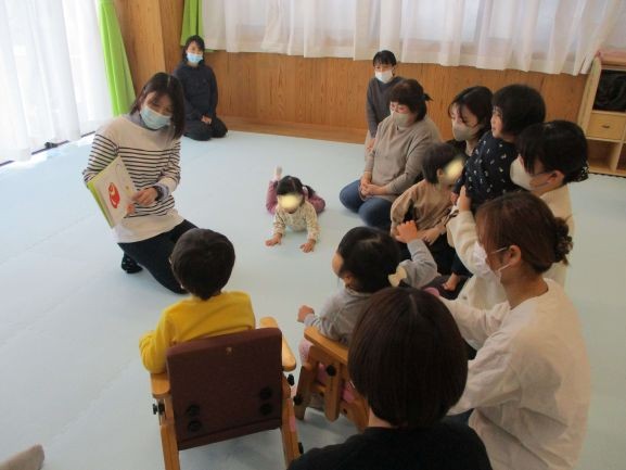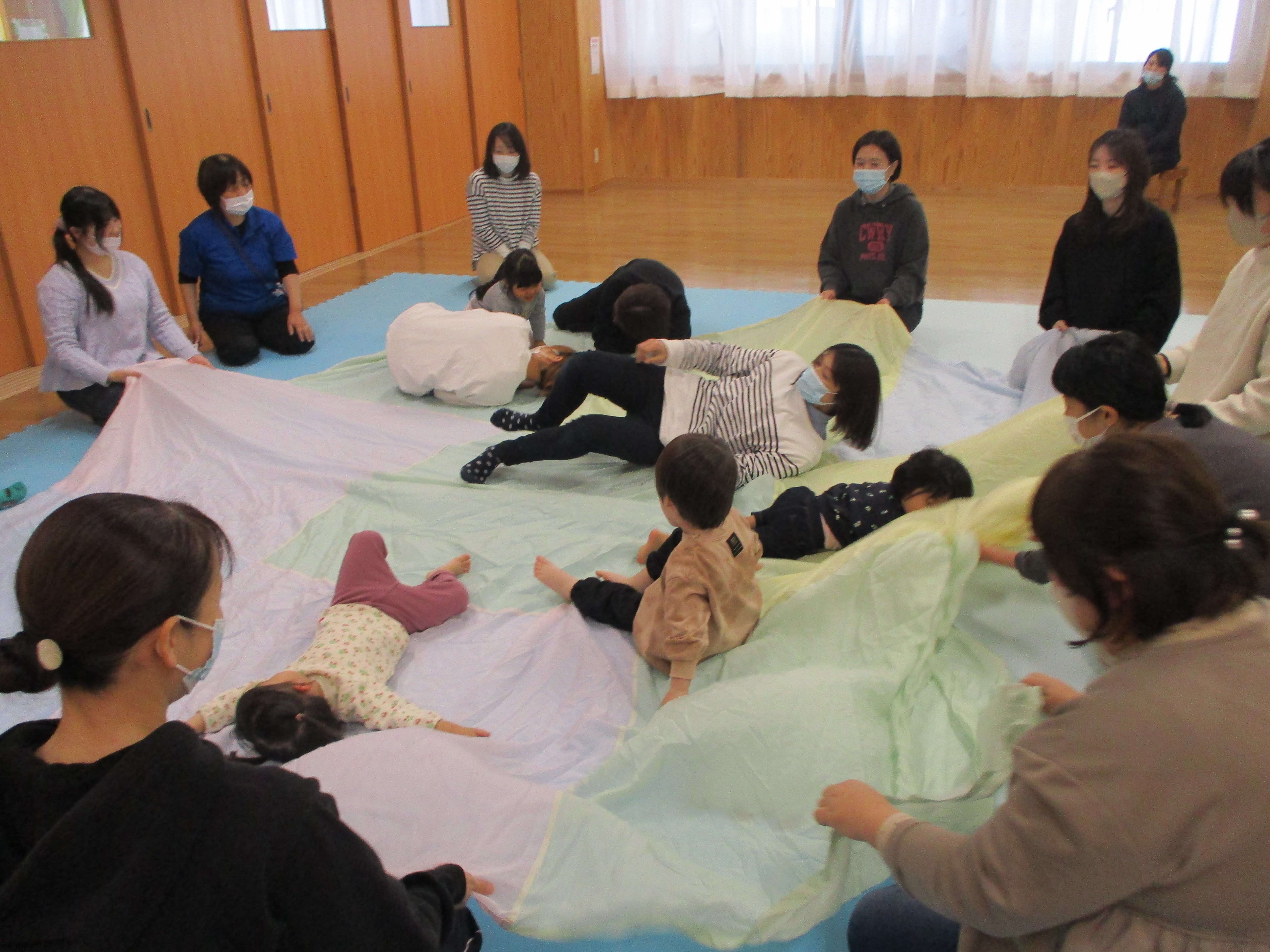 はじめは、少しどきどきする様子も見られましたが、楽しい音楽に合わせて親子のふれあい遊び楽器やバルーン遊びをして、たくさんの笑顔が見られる時間を過ごせました。