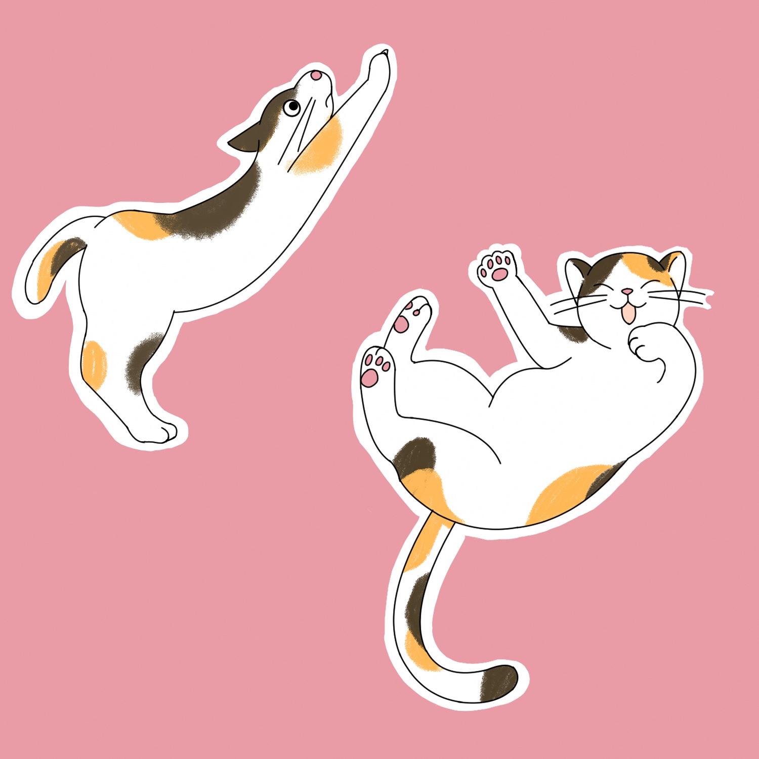 三毛猫ちゃんが爪とぎする姿や寝転んでうにゃうにゃしている姿をかわいらしく描きました。