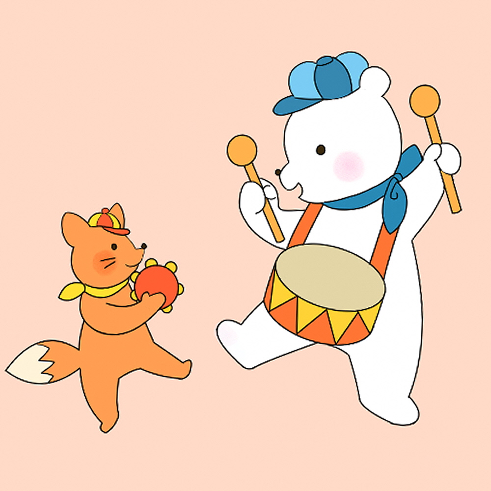 しろくまの小太鼓と、きつねのタンバリンで音楽隊を結成!音色を響かせて音楽隊の仲間を探しに行こう☆