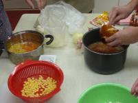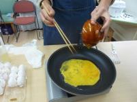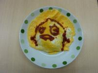 今回は「時短」を意識して取り組みます。タマネギ、ベーコンなど具材を細かく切り、ケチャップやコンソメでしっかり味のケチャップライスを炊飯器で炊きあげます。卵でふんわりオムライスの完成ですが、最後に今回の工夫、ケチャップでイラストや文字を描いて「メッセージ」を入れます。「何を描こうかな?」「これいいよね」「ケチャップが流れる」「おいしそう」など、つぶやきが聞こえるうちにメッセージ・オムライスが完成。卵も上手に焼け、みんなでおいしくいただきました。