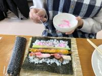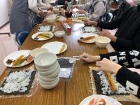 2月3日の節分を前に恵方巻を作って食べました。恵方巻きは福を呼び込み幸福を願う行事です。七福神にあやかって、卵焼き、しいたけ煮、かんぴょう、きゅうりなど、7種類の具材を入れました。出来上がった太巻きは、今年の恵方、南南東の方角を向いて一本まるごと頬ばりました。みんなですし飯を用意したり、具材を作ったり、すのこで巻いたりするのもとても楽しい時間でした。