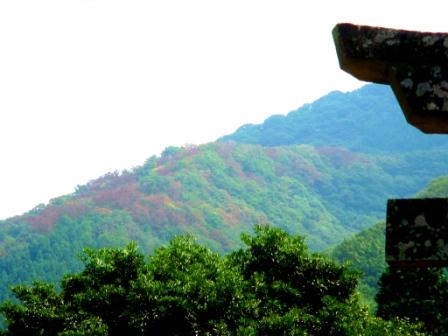 鳥居の横から臨む三徳山麓、標高からすると被害木はコナラでしょうか。