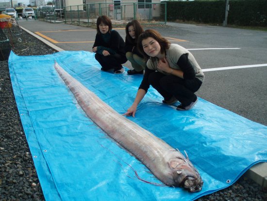 またもや伝説の魚「リュウグウノツカイ」が発見されました。今年2回目で1回目と同じく境水道内で発見されたのは驚きです。ゲゲゲの街境港ならではの不思議な現象なのでしょうか?期日:2009年11月20日(午前9時頃)場所:美保関町宮谷付近の境水道捕獲者:釣り人状況:衰弱し岸辺に浮かんでいるところを仲間4,5人で捕獲した。和名:リュウグウノツカイ全長:4.3m体高:30cm