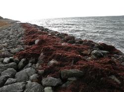昨年は12月中旬には大量のオゴノリが干拓地排水ポンプ場より北の海岸に堆積していたが、今年は強い北西風がほとんど吹かず、1月に入り堆積が始まった。 しかし、昨年とは異なり今年はエプロン部分にのみ堆積が見られ、なだらかな護岸部には無く、石組の隙間にぎっしり海藻が詰まり、回収し難い上に隙間の中は乾燥しにくく、腐敗が進むものと思われる。 |