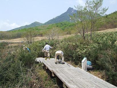 5月10日(木)、大山隠岐国立公園内にある鏡ヶ成(江府町)にて行政関係機関やボランティアなど総勢20名で湿原の保全作業を行いました。