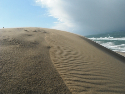 鳥取砂丘は、海から岸辺に運ばれた砂が、北西から吹く強い風で陸に飛ばされできました。