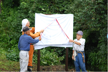 8月18日、集落住民が集まって看板のお披露目セレモニーが行われました。紅白のひもを引いたのは自治会長さんと、この企画を発案した笑和会(60歳以上の全住民で構成された相互扶助団体)の会長さん、そして集落最長老で看板の題字を書かれた清水要範さん。