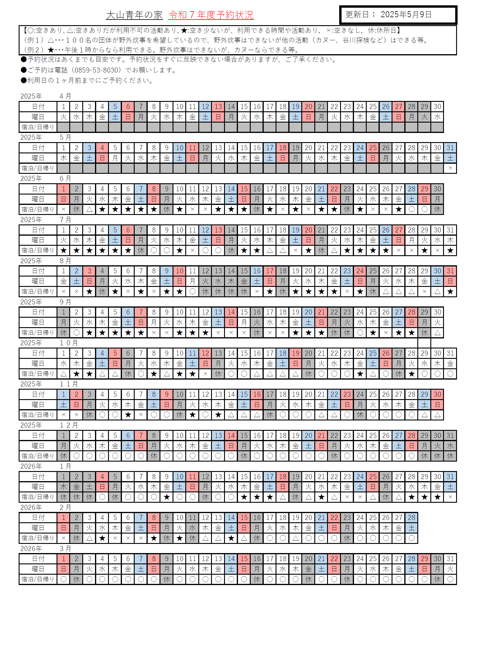 R7,8年度大山青年の家 予約状況 (外部サイトへ移動します)